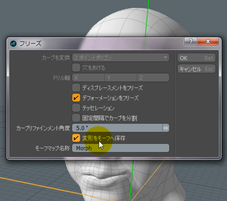 形状メニュー > フリーズを実行します。フリーズは変形しているジオメトリをその変形状態のままメッシュへと反映させる機能ですが、この変形状態をベースとなるメッシュではなく、モーフマップへと反映させる方法があります。今回の場合、変形つまりデフォーメーションの結果をフリーズさせますので、デフォーメーションをフリーズボタンをオンにし、変形をモーフへ保存オプションをオンにします。保存するモーフマップの名称を指定し、フリーズさせます。