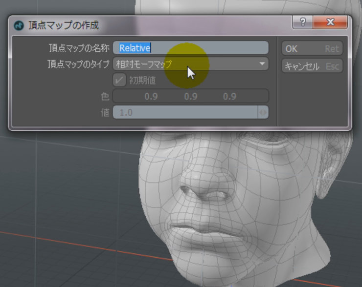 相対モーフとはベースメッシュに対して、各頂点位置の差分の情報を頂点マップとして保存します。これに対し、絶対モーフとはモーフマップでの位置情報を、そのまま頂点マップとして保存します。このため、差が生じている頂点箇所だけを保存する相対モーフに比べ、全ての頂点情報位置を保存する絶対モーフマップの方が情報量は多くなります。