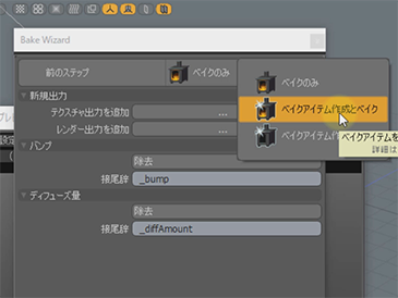 プロジェクションタイプを立方体にしていましたが、これを通常のUVでマッピングできるよう、ベイクしましょう。ベイクの設定はベイクウィザードを使うと非常に簡単です。ゲームパレット > ベイクサブタブ > ベイクウィザードを起動します。UVを指定し、ターゲットマテリアルをこのメッシュ自身のマテリアルグループを指定します。このメッシュをターゲットに指定し、テクスチャ出力を追加からバンプとディフューズ量とを追加したら、ベイクのみメニューを長押しして、ベイクアイテムの作成とベイクを実行します。そうすると、テクスチャがベイクされるだけでなく、ベイクアイテムも作成されるようになります。