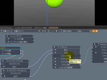 まずは球体のマテリアルをスケマティックビューへとドラッグアンドドロップし、追加シェーダ入力レイキャストを追加します。レイキャストを追加すると、デフォルトでシェーダ入力のノードからシェーディングする箇所(サンプル)と法線の情報がレイキャストノードの起点方向に接続されていますので、レイの放射元となるこの情報を、ロケータの位置情報と回転情報へと置き換えましょう。ロケータをスケマティックビューへとドラッグアンドドロップし、右クリックでコンテキストメニューからチャンネルの追加を選択し、ワールド位置ワールド回転を追加します。