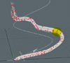 試しに、シミュレーションボタンをクリックしてみましょう。パーティクルが床に衝突し、跳ね返るようになりました。跳ね返りが十分でないようなら、パッシブリジッドボディである床のメッシュを選択し、ダイナミクスのタブから跳ね返りの値を大きめに設定してみてください。