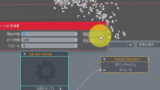 追加 > パーティクル > Particle Simulationを追加します。わかりやすいように名称を、Particle Simulation Newとでもしておきます。このParticle Simulation Newで発生元となるパーティクルは、先ほど消滅したパーティクルとなりますので、その場合のエミッターはコレクター/エミッターとなります。このエミッターのオペレータに、先ほどのParticle Operatorを接続します。さらに衝突したタイミングでパーティクルを放射したいので、衝突イベント(R/O)をパーティクル放射へと接続します。これでタイミングはOKですが、どの位置からパーティクルが発生するのかを指定する必要がありますので、Particle Operatorからはパーティクル特性の追加から追加した位置(R/O)の情報を、エミッター側で追加した位置へと接続します。Particle Simulation Newの色とサイズを変更したら、シミュレーションで確認してみましょう。