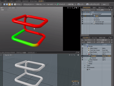 サンプルにはカーブに従ってカーブで押し出しで作られています。メッシュのマテリアルに対して、シェーダツリーのレイヤー追加 > 処理 > Gradientを追加します。そのままの状態でグラディエントの色を設定してみます。デフォルトでは入力パラメータが入射になっていますが、カーブで押し出しで作られたメッシュは、押し出された方向に従ってUVが作成されていますので、入力パラメータをサンプルパラメータの中にあるテクスチャUに設定し、テクスチャロケータのタブからUVの設定を行います。
