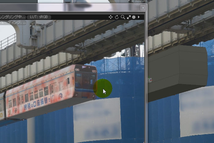 次に写真内の電車に合わせるようにボックスツールで簡単にメッシュを作っていきます。パースペクティブなど他の視点から見てみると、シンプルなメッシュが作成できたのが確認できます。プレビューで確認してみると、写真の中にCGの電車が表示されているのがわかります。このCGのボックスに対し、投影テクスチャを使うことで、簡単に写真をマッピングすることができます。