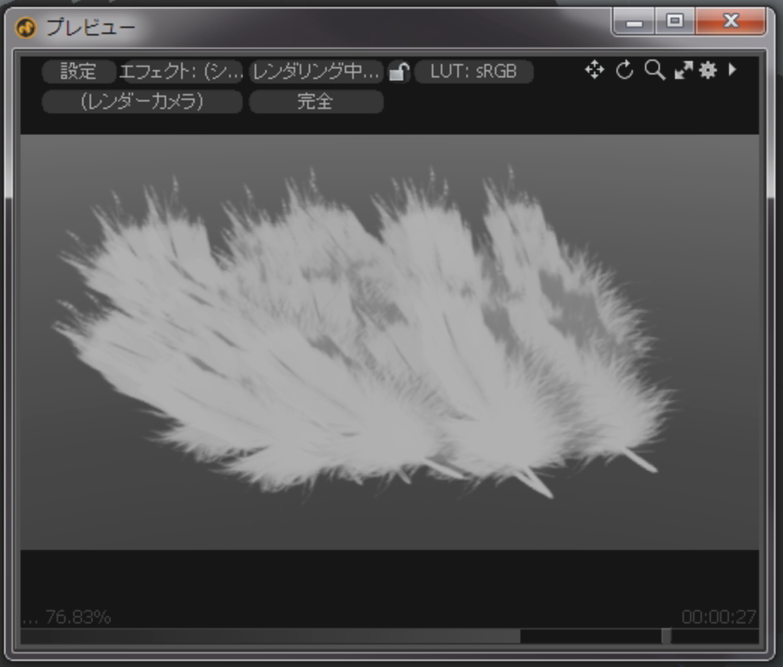 屈折深度の値を調整するには、シェーダツリーからRenderを選択し、設定サブタブ > シェーディング品質の中にある屈折深度の値を調整します。試しにこの値を1に設定してみましょう。重なり合っていない個所の羽はきちんと透過されていますが、重なり合っている箇所では正しく透過されていません。屈折深度の値は、透過を行ったメッシュにぶつかる際に、何回先に進むのかを指定する値です。デフォルトではこの値が8になっていますが、今回のように透過画像が多数シーンに存在する場合には、それだけだと十分ではない場合があります。その場合には、値を高くすれば、正しく処理されるようになります。ただし、この値を高くするということは、それだけ処理が重ねられることになりますので、全体のレンダリング時間は長くなってしまいますので、ちょうど良い値を見つけるよう注意するようにしてください。