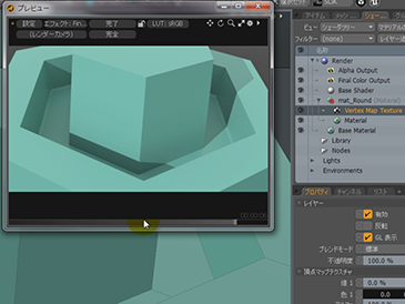 このサンプルモデルにはあらかじめエッジウェイトが設定されています。このエッジウェイトがかけられている箇所に対してのみ、丸めの処理を設定してみます。シェーダツリーからレイヤー追加 > 処理 > Vertex Map Textureを追加します。このテクスチャは頂点マップでコントロールするテクスチャとなります。エフェクトがデフォルトではディフューズの色になっていますので、これをサーフェイスシェーディング > 丸めエッジ幅へと変更します。そうすると、エッジウェイトが設定されているエッジに対してのみ、丸め処理が行われているのがわかります。このようにウェイトを使えば、設定した箇所に対してのみ簡単に丸め処理が行えるようになります。