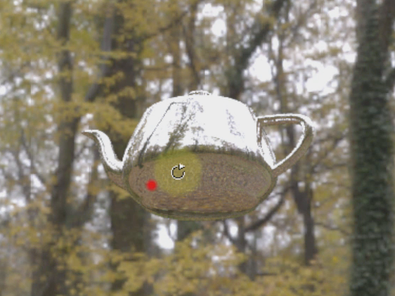 試しに、ティーポットを配置して映り込みを確認してみましょう。スペキュラを100%、ラフネスを0%にして、鏡面反射を表現してみると、鏡のような映り込みが確認できるようになります。