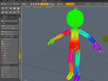 今回は、バインドタイプをヒートに設定してみます。このヒートは、キャラクタモデルのスケルトンのように、入り組んだ形の構造になっている場合に非常に有効です。そうすると各スケルトンに対して、自動的にウェイトマップが設定されたことがわかります。