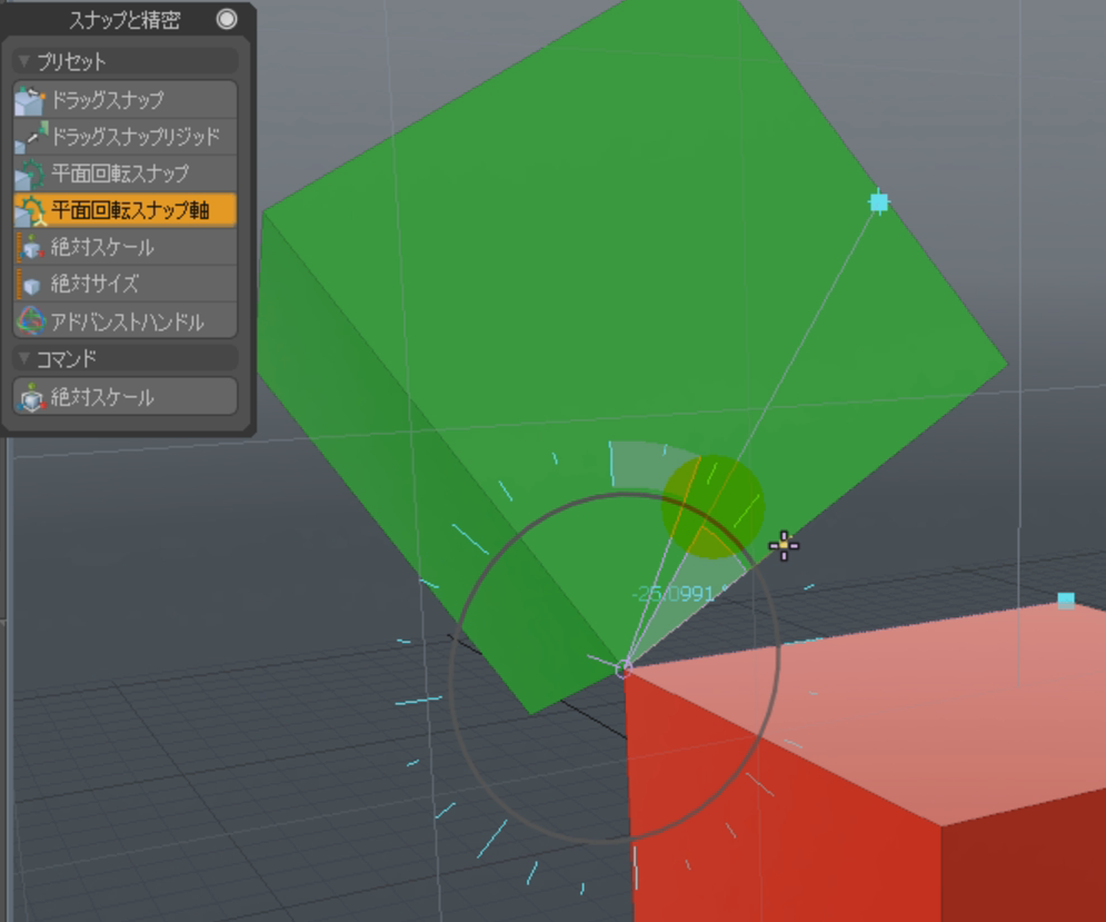 スナッピングの機能を利用したツールとして代表的なのがスナップと精密パネルの中にある移動を行うドラッグスナップと、ドラッグスナップリジッド、そして回転を行う平面回転スナップと平面回転スナップ軸です。