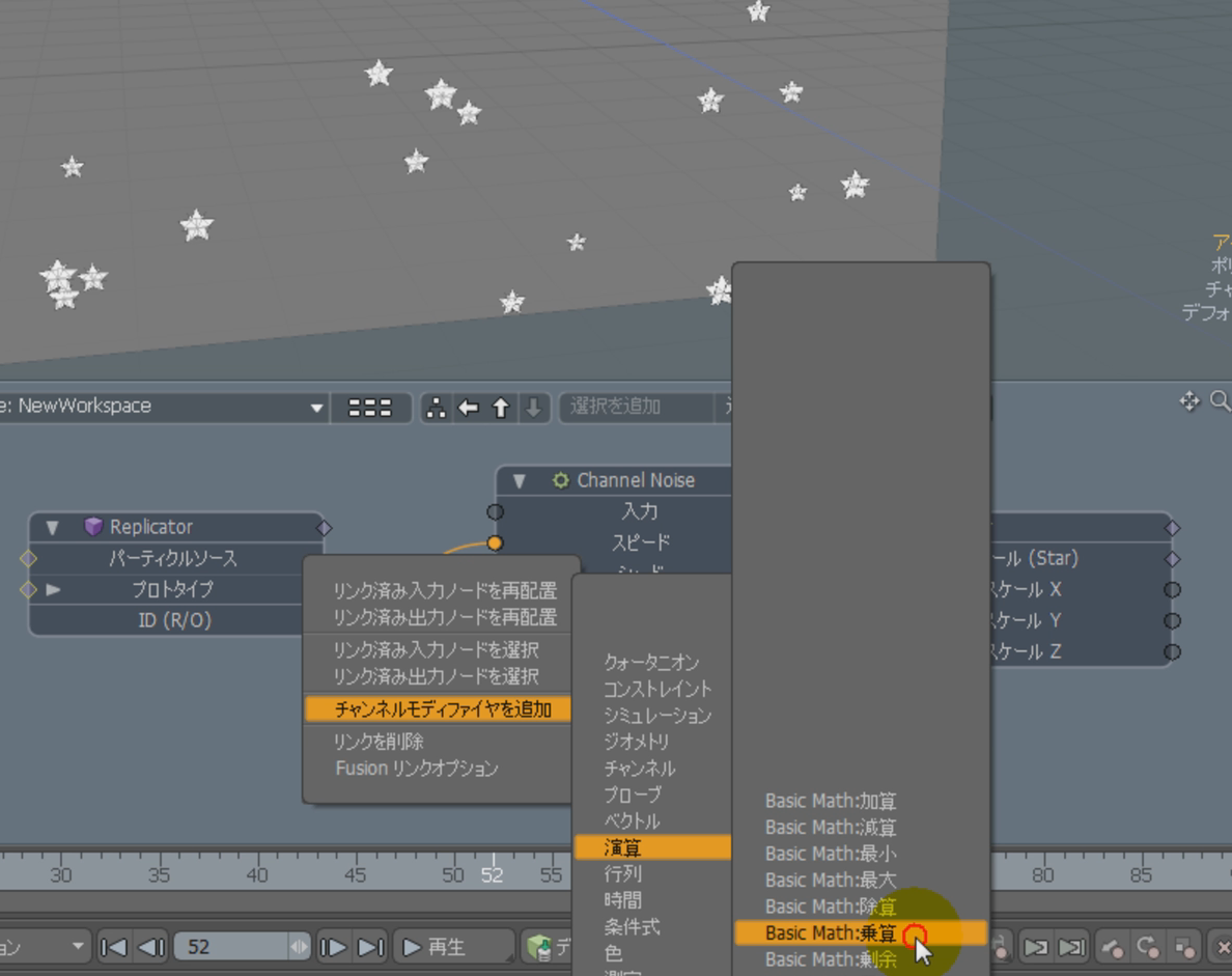 スケマティックビュー > 追加 > チャンネル > Channel Noiseを追加します。これが細かく震える動きを作り出すモディファイヤのノードとなります。まずはこのノードの出力値を星のスケールへと接続してみましょう。設定したスケールが反映されるように、リプリケータの原型のトランスフォームを使用オプションをオンにしておきます。