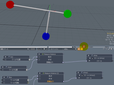 これを設定するためにはスケマティックビューで簡単なリグを組みます。まずは設定するメッシュのX軸に対するスケールのチャンネルを追加します。スケールに対して必要になるのは、赤と緑のアイテム間にある距離ですので、距離を測定するノードを追加します。追加 > チャンネルモディファイヤ > 測定 > Measure Distanceでノードを追加したら、赤と緑のワールド位置のチャンネルを追加し、起点と終点に接続します。このノードで導き出される距離の値を、そのままスケールのノードへと接続します。ラインのメッシュは長さ1メートルで作成したので、この距離の値がそのままスケールの値として使うことができます。