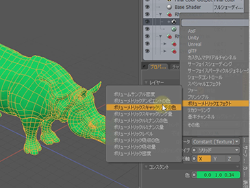 モデルをもとにしたボリューム表現の場合、元にしたメッシュに対し、まずはアイテムマスクを作成します。アイテムリストからもとになるモデルを選択し、右クリックからコンテキストメニューを開き、シェーディング > アイテムマスクの作成でマテリアルグループを作成します。ここからボリュームに対する質感を設定しますので、例えば、単純に色を変えたい場合、レイヤー追加 > 処理 > Constantを追加します。このテクスチャは単色を指定するテクスチャですので、ここで色を変えてみます。